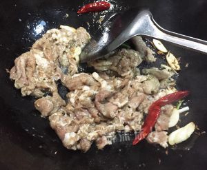 煸出香味后放入腌制好的羊肉片,大火翻炒。