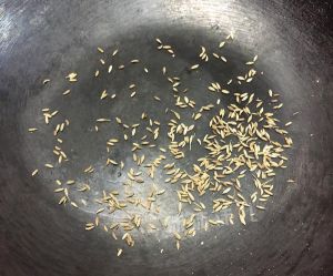锅中无水无油,放入一勺孜然粒小火焙香。有香味飘出后盛出备用。整个时间很短,千万不要等变色变糊。
