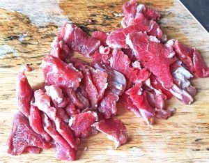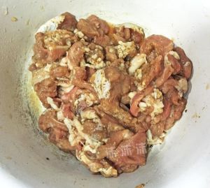 羊肉切片,放入淀粉、生抽、料酒、孜然粉,腌制半个小时。