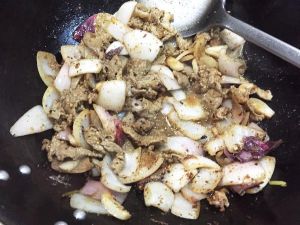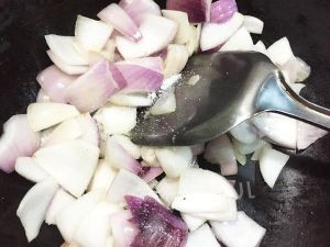 将蒜瓣、姜末和洋葱倒入锅中,爆炒至洋葱软烂;