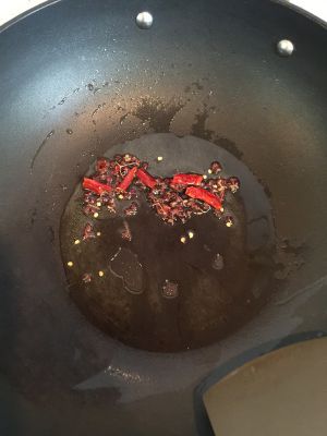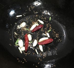 然后热锅冷油(大火热锅后,放油,然后不等油烧热直接下菜,就是所谓的热锅冷油),放入葱、蒜、干辣椒和之前焙香的孜然粒,中火煸炒。