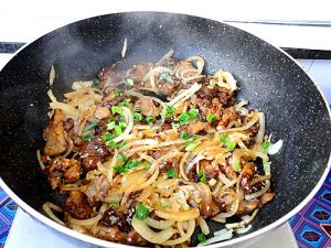 洋葱快好的时候再放羊肉,然后加一点料酒,胡椒粉(都是去腥膻的),根据口味加孜然和盐,就可以啦