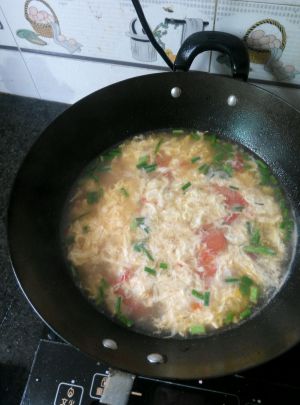 待汤烧开,将打好的鸡蛋散在上面,待锅开后放盐味精及葱花!好了西红柿蛋汤就出来啦!!!!