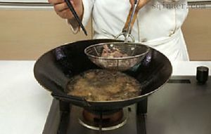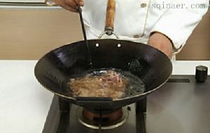 羊肉变色后捞出,把油倒出,锅里留少量的油。