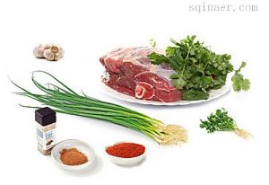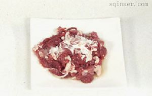 2.草原羊肉洗净、切片。装在盘里,加葱姜、料酒、盐、味精、白糖、水淀粉拌均匀腌入味。