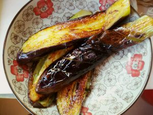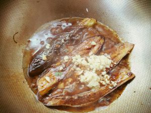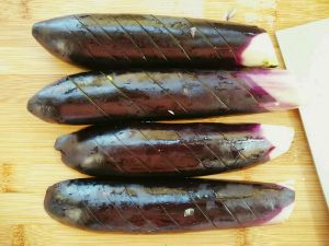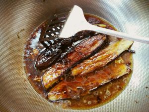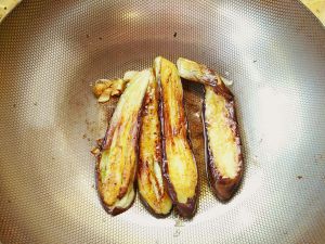 将茄子炸至表面金黄色捞出,放入盘中备用。