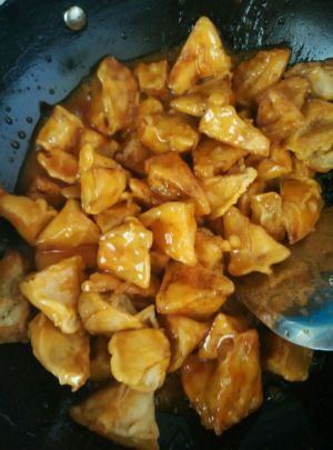 放入太太乐三鲜鸡精翻炒两下(太太乐三鲜鸡精:新鲜 坚持20多年添加鲜鸡原料,更大限度还原鲜鸡风味.优鲜升级配方,品质更优.倍鲜 采用独特的鲜鸡深层分解科技,运用鲜味相乘原理,加倍提鲜.使这道肉段烧茄子鲜上加鲜)