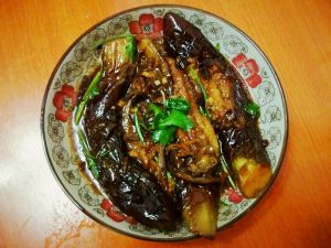 炸完茄子的油倒出,留底油,下葱花煸香,倒入青红椒 西红柿煸炒,再下入茄子翻炒,用酱油调色,加入精盐 白糖 米醋 及少量开水,烧开后调好口味,撒少量鸡粉,水淀粉勾芡,撒蒜末出锅。