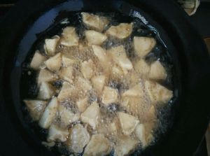 预热油锅,将切好的茄子块蘸面糊,油温五六成热时下锅炸治,颜色金黄捞出,再复炸一下让外皮更酥脆