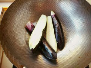 锅中放入适量的油,烧至8成热,放入茄子快。