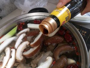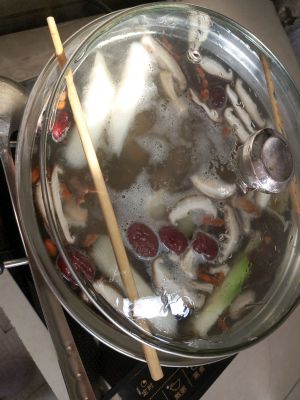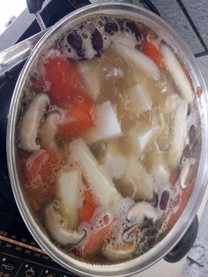 待水开之后,放入适量盐、鸡精、和调料包(我是用纱布把上面跟大家说的调料包在一起,用线绑住纱布,做成一个调料包),并放入玉米、胡萝卜块、山药块。盖上锅盖,用小火慢炖一个小时。