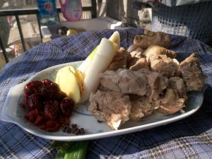 除去血水浮沫的排骨、葱段、姜片、红枣、枸杞、花椒装盘备用
