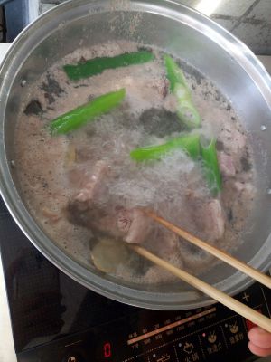 热锅,放适量油炒葱段、生姜片、排骨,爆炒一下。然后加入大量水,一定要是大量水哦~中火开始炖排骨。