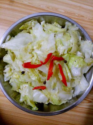 包菜略变色,放蒜葱,继续翻炒。放盐,调味料,出锅前放鸡精