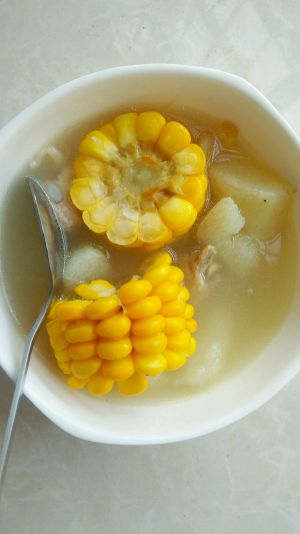 电饭煲或者砂锅放凉水,将排骨,玉米切段,山药切成滚刀块,姜切片,放入锅里。中火煮40分钟后倒入一小勺料酒(一定不要太多不然会变味),加一勺半盐。