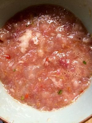 猪肉剁成末,放入刚刚摸玩酱料的碗里,加入料酒,盐,蛋清用筷子拌匀