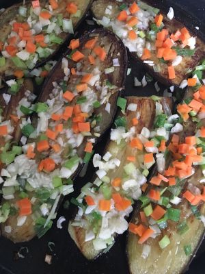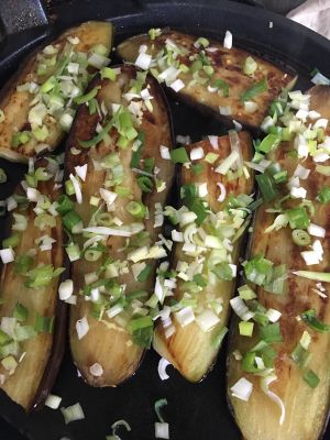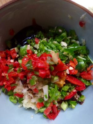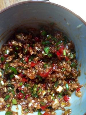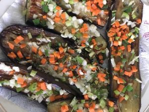 茄子切花,将蒜,青椒 小辣椒全部剁碎撒在茄子上,淋上酱油和色拉油,放入微波炉烤约10分钟。