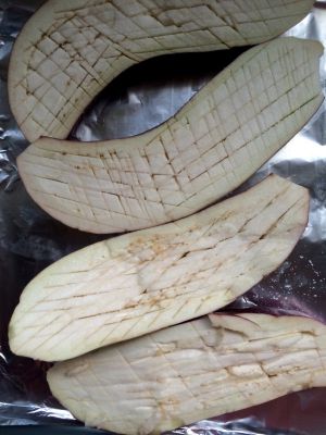 烤盘上铺锡纸,茄子切两半皮上抹点橄榄油