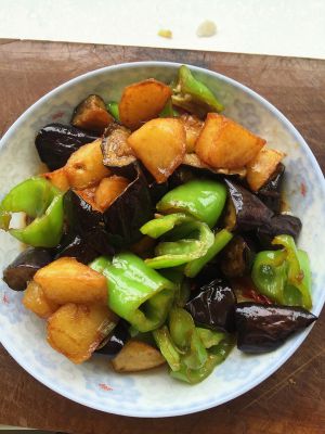 葱姜蒜辣椒大火爆香,下土豆茄子翻炒两下以后加入青椒继续翻炒,放入盐,酱油,翻炒均匀加一点水,不然会太干。出锅前加一点点鸡精提鲜。好啦,大功告成。