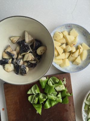 将土豆、茄子洗净切成滚刀小块,青椒掰成小块备用。