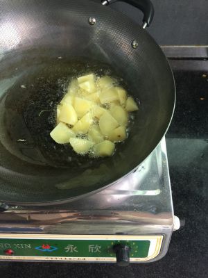锅里加油、凉油下入土豆升温炸至表面微黄。