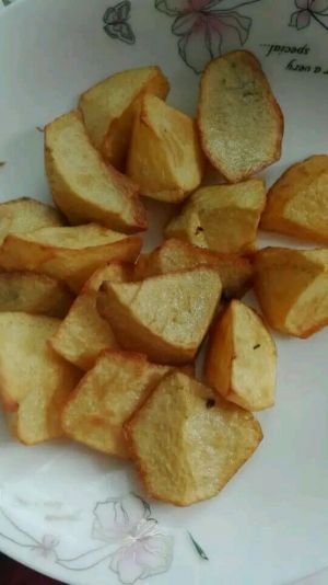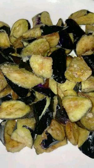 慢火炸土豆和茄子,炸至金黄。先炸土豆,外皮金黄后下茄子稍微时间短一点。捞起来。这是刚下锅。