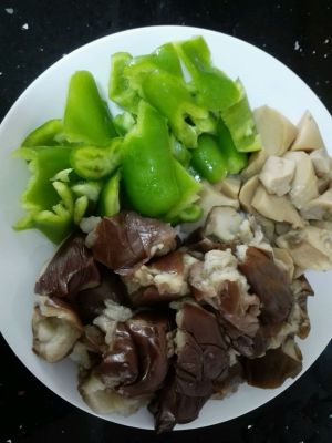 把蒸熟的茄子凉凉后挤出水装盘备用,把切成菱形块的尖椒一起备用。家里剩了点杏鲍菇一起做了,正常是不用加的。