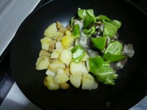 把土豆倒进一起翻炒,加花椒粉,姜蒜末,炒出香味,加砂糖,生抽,盐,再倒入青椒块,翻炒一会,最后勾芡出锅。