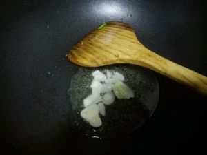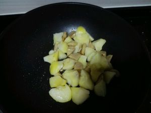 锅中加少量油,加入蒜片,放入土豆煸炒。。
