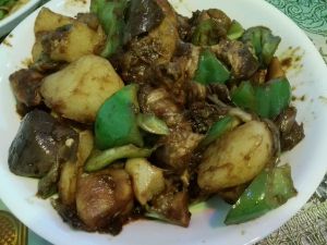 放入辣椒、炸好的茄子、土豆炒,最后放入蒜末即可