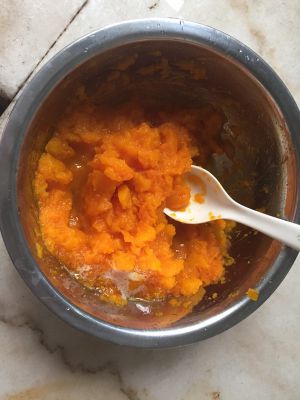 蒸好的南瓜捣成泥,加入准备好的两汤匙蜂蜜,搅拌匀