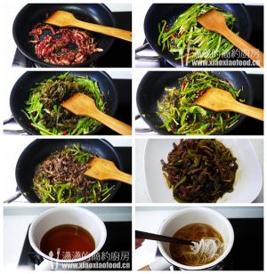 炒锅加热,入1匙油,下牛肉丝翻炒到8-9成熟盛出。