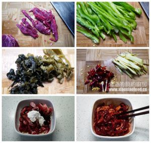 酸菜、牛肉、青椒、姜分别切丝,干红椒切小段备用。