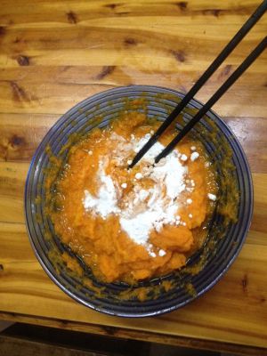 慢慢往南瓜泥里加入糯米粉,加一点搅拌一会儿,保证混合均匀,硬度适中。