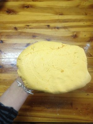 南瓜泥趁热分多次加入糯米粉,不停揉搓至不粘手。