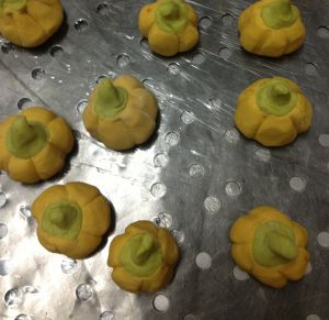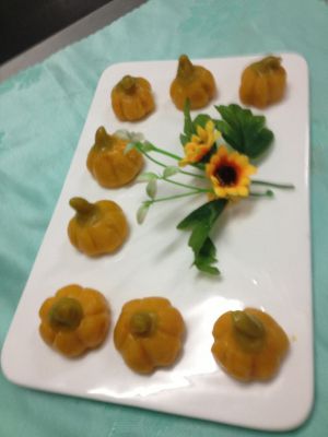 取一小团南瓜泥像包饺子那样中间包入甜馅捏好,顶上用韭菜南瓜泥搓个小瓜蒂捏上,南瓜饼身用筷子有棱角一头划几道刻痕即可,做好的南瓜饼上蒸锅蒸十至十五分钟即可。