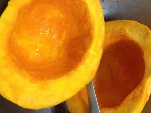 南瓜一个,约300克,洗净,切开去籽,上屉蒸熟。