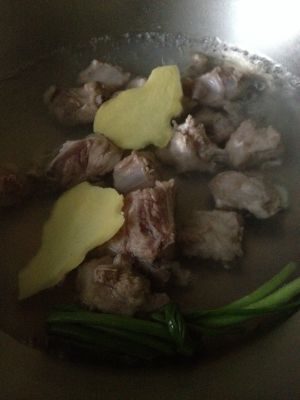 再另起一锅水煮开放入排骨、姜、葱结,一大勺料酒煮至排骨断生八分熟,捞起控干水分