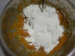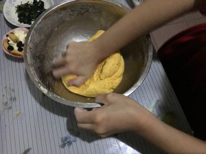 面粉中加入酵母和南瓜泥,和成南瓜面团饧发40分钟