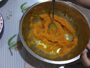 在南瓜泥中加入糯米粉,少许白糖,(因为南瓜本就甜)拌匀,反复多次加入糯米粉。 喜欢甜的可以多加点糖
