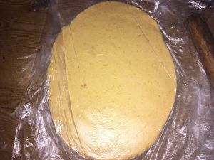 将南瓜团擀成片,不要太薄,可以在上面覆一张保鲜膜,这样南瓜不会粘在擀面杖上