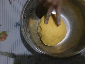 糯米粉,澄粉,糖和南瓜泥搅拌,和成面团