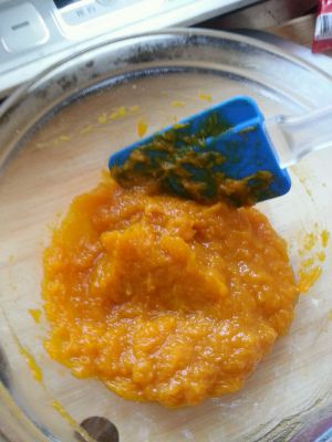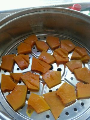 南瓜蒸熟,去皮捣烂成南瓜泥,加适量糖搅拌均匀