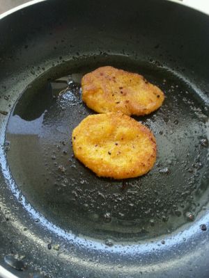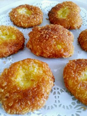加糯米粉,慢慢一点一点加,到什么样呢,就是融合在一起,还不成面团,我没照,靠想象。完了加面包糠,下锅。