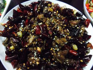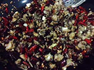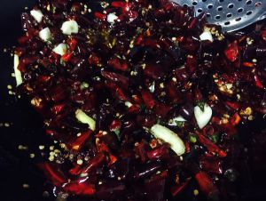 锅洗净重新烧热倒入适量的油,放入生姜,蒜瓣,花椒小火慢慢的爆出香味后,倒入干红辣椒继续小火慢慢的炸出红油来!