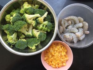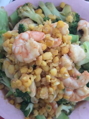 油热放入蒜瓣炒香。先放虾,大火爆炒,然后加入西兰花熟玉米粒翻炒。出锅前撒少许咸盐入味。即可享用。