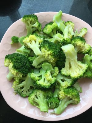 西兰花掰成小朵,芹菜切段,分别下沸水中焯一下,水中放少许盐和油。