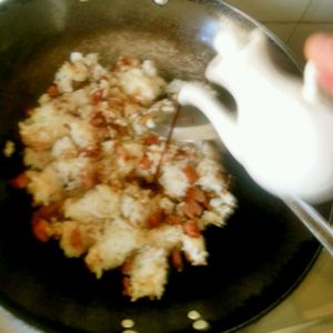 米饭和肠炒一炒匀,然后加生抽。不知道加多少量的话,生抽可以先加一点。