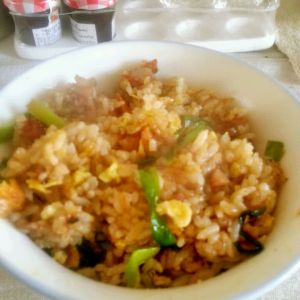 为了吃这碗炒饭,我一大早蒸了米饭等到中午炒饭吃。一般炒饭标准是要用剩米饭的,但剩饭不是一定要用隔夜米的,当天蒸的米饭让它晾一晾,让米饭中的水分蒸发一下,没有太大粘性了,炒起来就可以颗粒分明了。譬如早上蒸中午炒,如果急用,可以把米饭蒸的稍微硬一点,然后晾凉了就可以炒了。