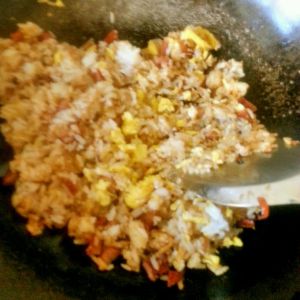 然后加入米饭翻炒,待米饭均匀上色后加入鸡蛋翻炒